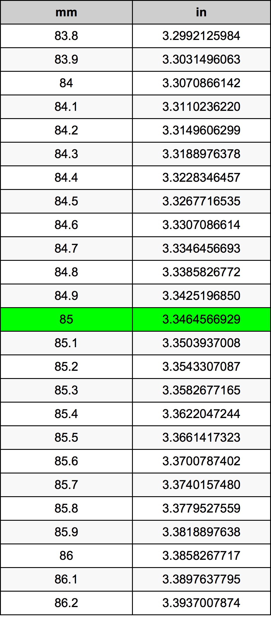 What is 85 mm converted to inches?