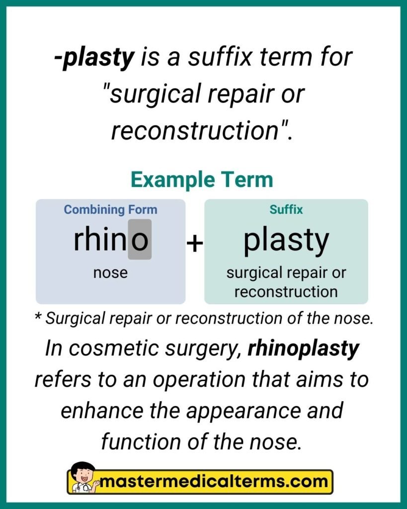 In medical terminology, “plasty” is a suffix that denotes a surgical procedure for reshaping, reconstructing, or repairing a body part.